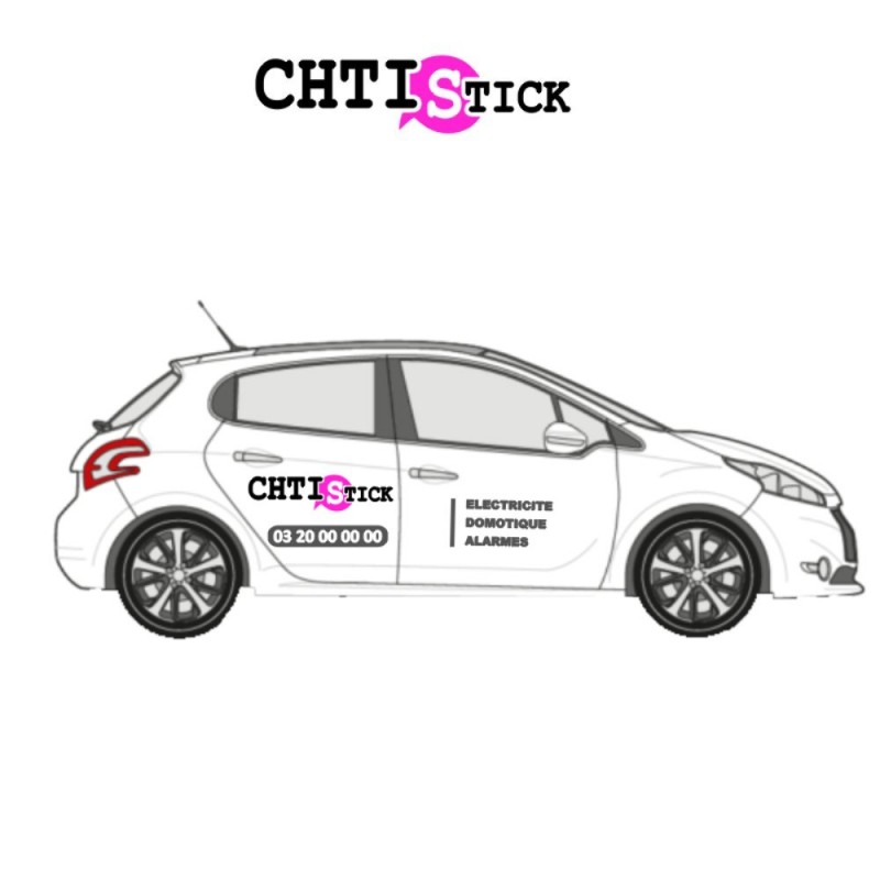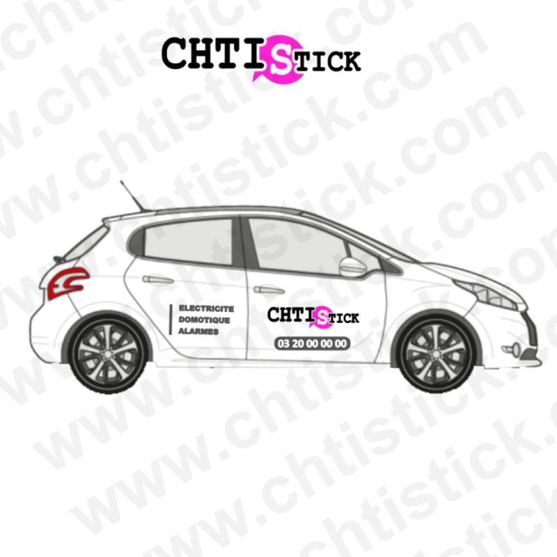 Marquage véhicule publicitaire. Ce marquage véhicule est adaptable aux véhicules style 208, Clio, Smart, C3, Mégane, Zoé .... modèle n° 1