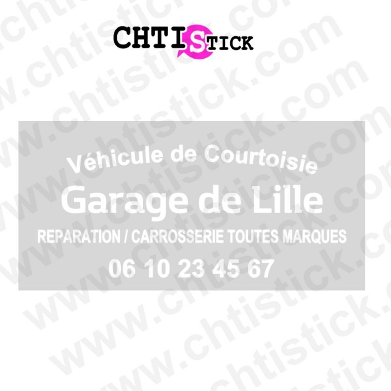 1 ligne véhicule de courtoisie + 1 ligne pour le nom de votre garage + 1 ligne pour votre service ou activités + 1 ligne pour numéro de téléphone et localité