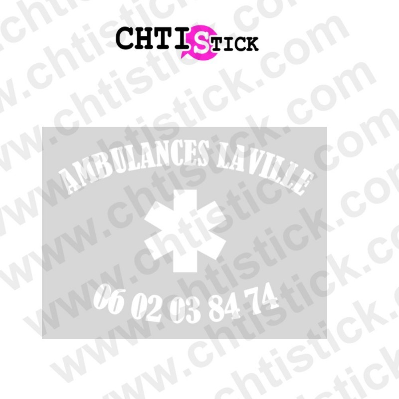 Marquage autocollant pour ambulance, avec texte arrondi, idéal pour vitres, ou carrosserie. Signalétique professionnelle et visible pour services d’urgence. avec numéro de téléphone