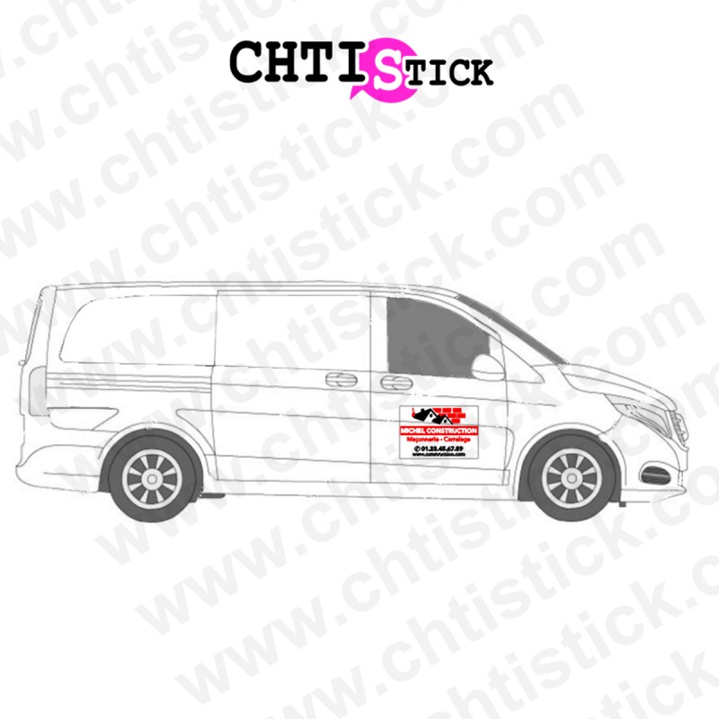 Autocollant et Marquage pour vehicule de chantier, utilitaire ou camion. Idéal pour portières fourgons artisans, maçons, couvreurs et entreprises du bâtiment pour afficher leur identité et leurs services. Autocollant imprimé sur fond blanc, personnalisable avec le nom de votre entreprise, votre activité sur 1 ligne, votre numéro de téléphone et votre adresse email