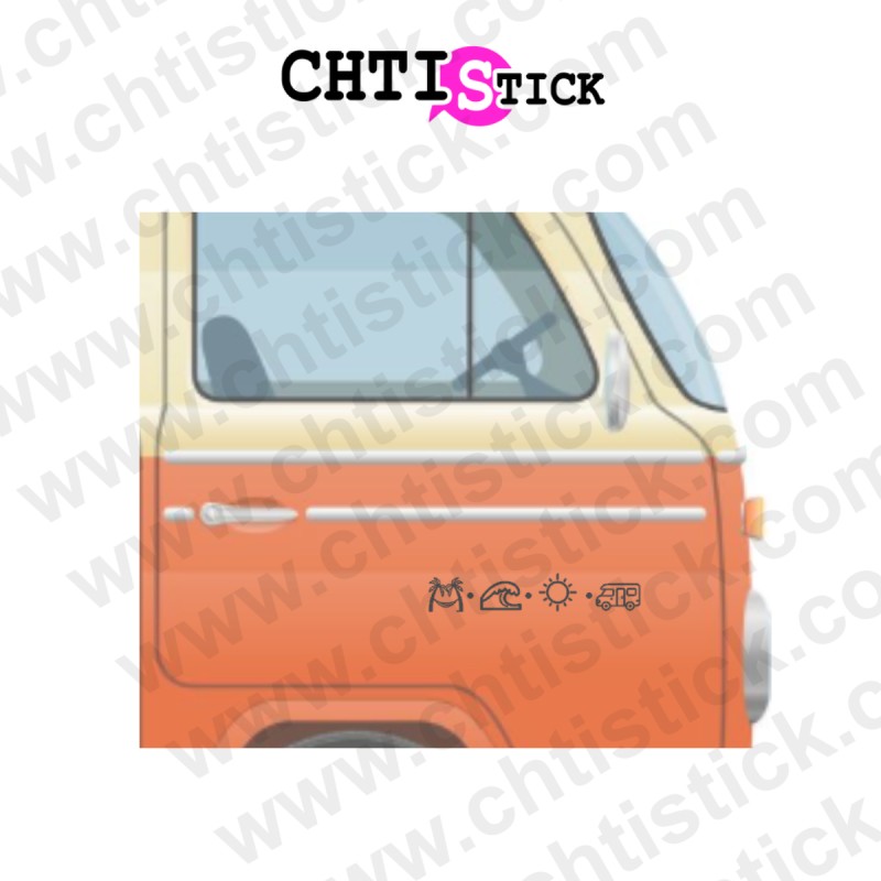 Personnalisez votre camping-car, van aménagé ou combi VW avec ce stickers camping car inspiré de la van life. Un design minimaliste représentant la mer, un camping-car, le soleil, parfait pour afficher votre passion pour le camping car.