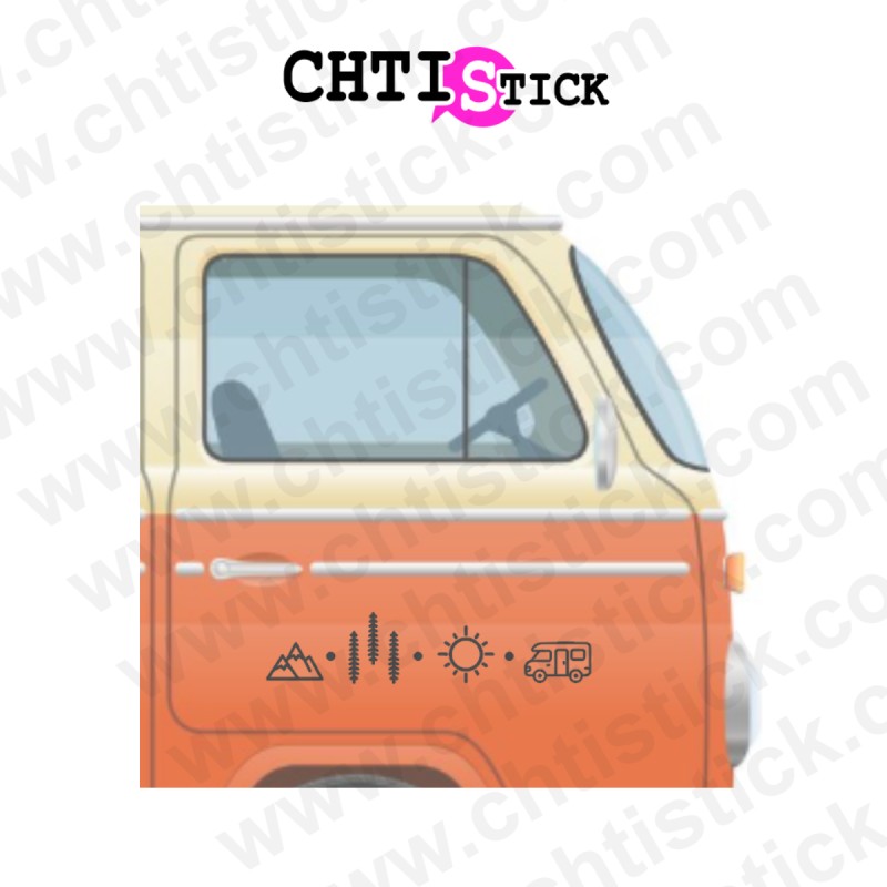 Personnalisez votre camping-car, van aménagé ou combi VW avec ce sticker campig car inspiré de la van life. Un design minimaliste représentant la montagne, l'aventure, un camping-car, la randonnée et le soleil, parfait pour afficher votre passion pour l’aventure et les grands espaces.