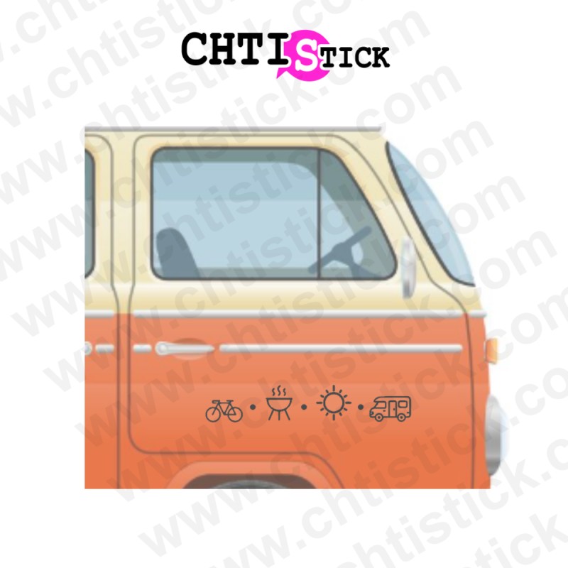 Personnalisez votre camping-car, van aménagé ou combi VW avec ce sticker camping car inspiré de la van life. Un design minimaliste représentant le vélo, le barbecue, un camping-car, et le soleil, parfait pour afficher votre passion pour l’aventure et les grands espaces.