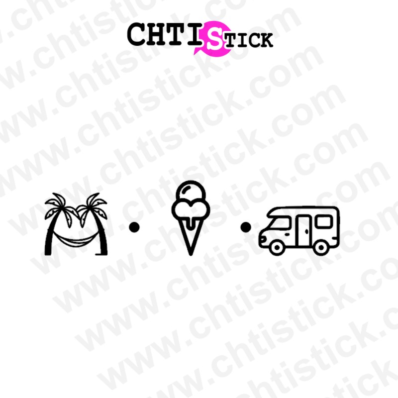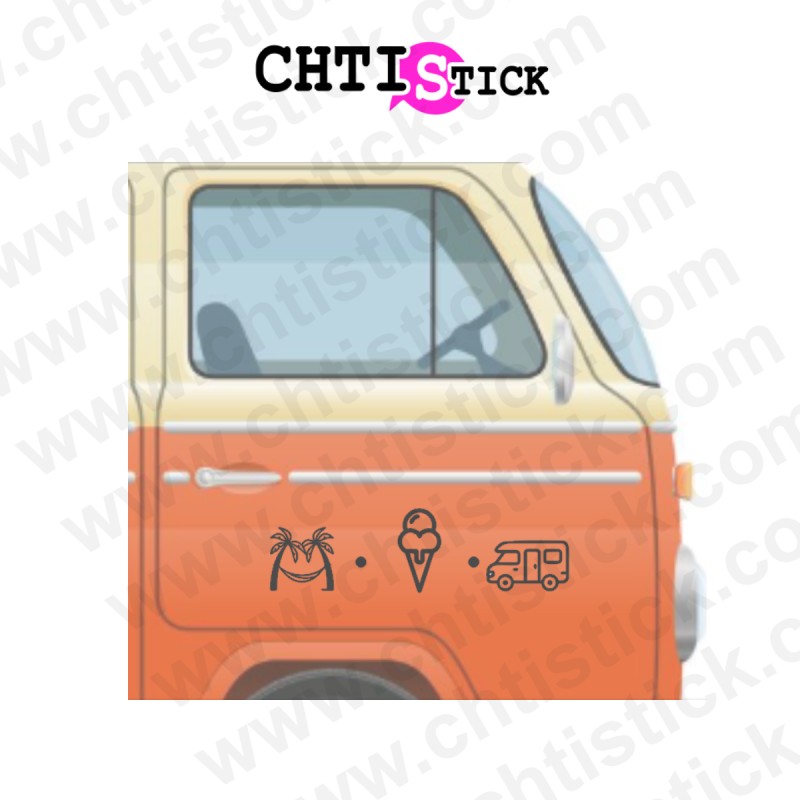 Personnalisez votre camping-car, van aménagé ou combi VW avec cet autocollant amping car inspiré de la van life. Un design minimaliste représentant le hamac, la glace et le camping-car, e parfait pour afficher votre passion pour l’aventure et les grands espaces, van life