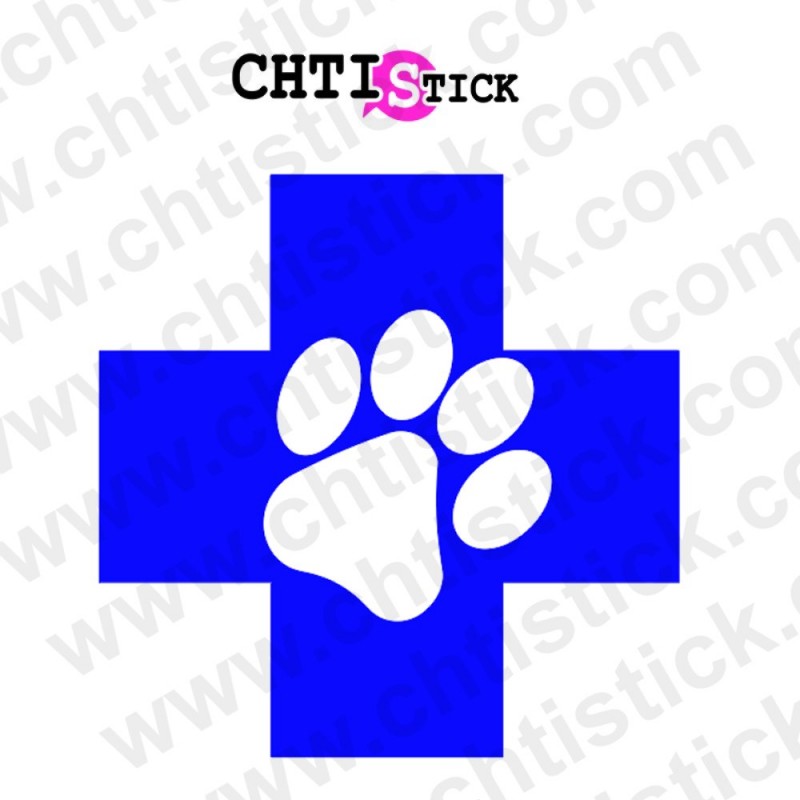 Sticker croix avec empreinte d’animal, idéal pour vitrine de cabinet vétérinaire ou salon de toilettage. Vinyle professionnel résistant, visible et décoratif.